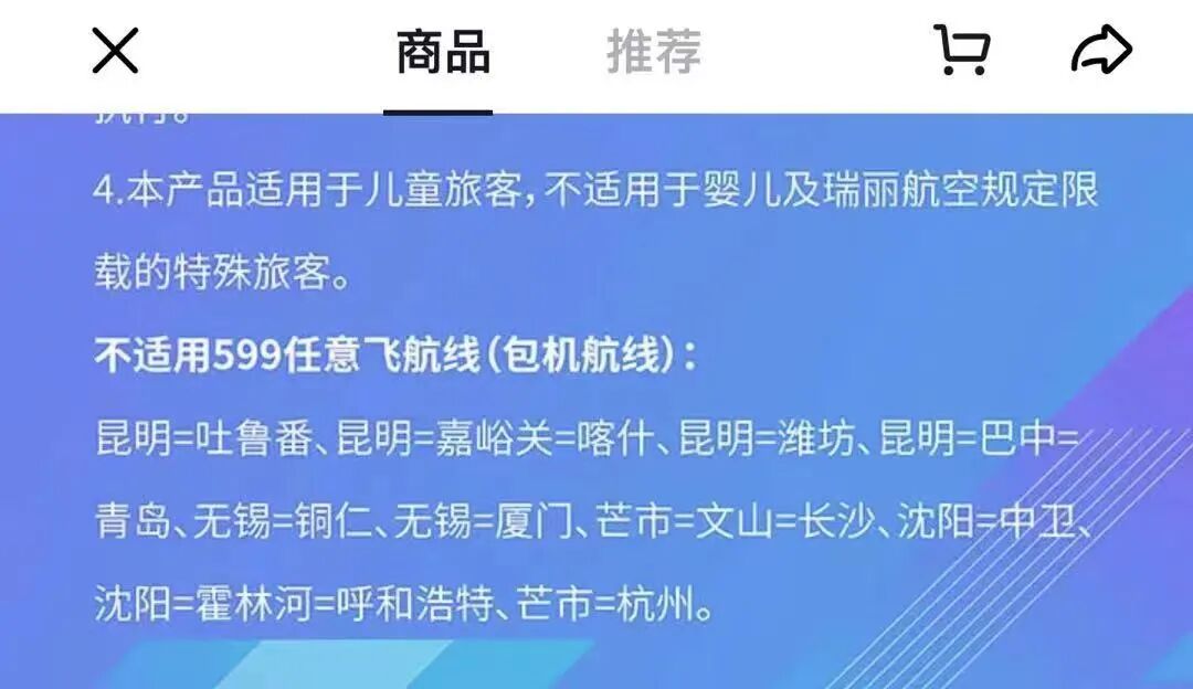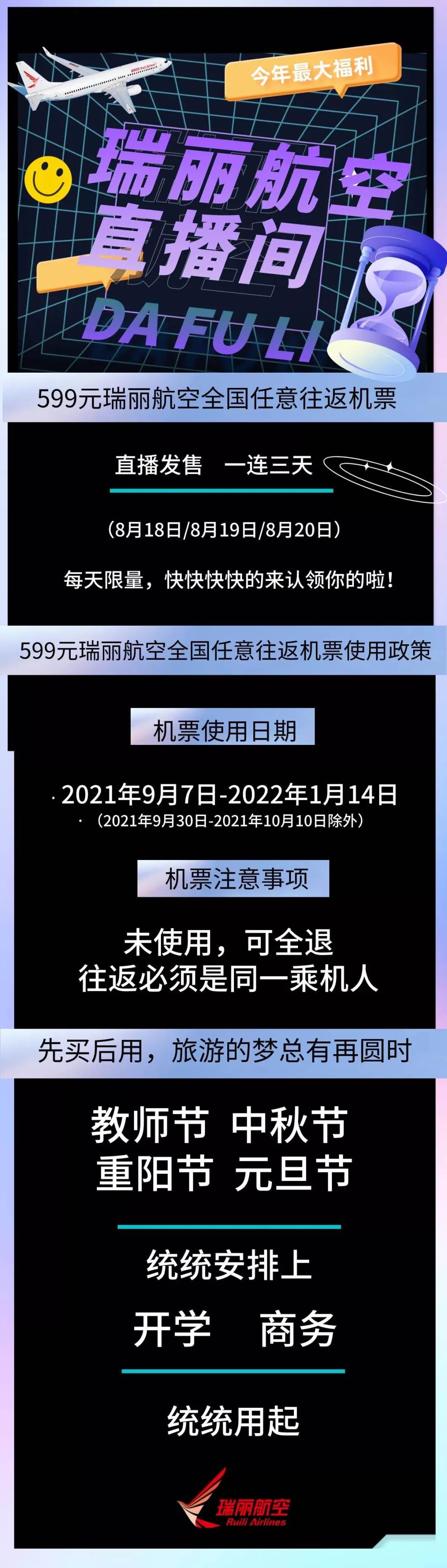 瑞丽航空599国内任意往返套票、南航400元国内任意飞学生票! 机票 作者: 小爆 2021年8月19日 15:01 174,933 浏览 评论已经关闭 昨天,瑞丽航空也推出一个599元的往返机票通兑券,在他们家的抖音直播间卖。直播间买东西就是有个不爽的地方,得听主播磨叽半天 价格不错,但每个航班3个兑换名额,格局小了…可用的日期是9/7-1/14,9/30-10/10不适用。 可以通兑瑞丽航空的大部分航线 部分航线不可用: 值得玩味的是,瑞丽航空这个产品用的小标题是“今年最大福利”,你看,“最大”也就这么大了,所以「随心飞」无望了呗? 这个产品在抖音连续卖3天,今明两天还各有一场,14点开始,有兴趣的就设置个闹钟,蹲一蹲。 对了,学生朋友们,南航现在有个400元购买国内任意航线的活动,不少同学直呼真香 比如还支持广州-拉萨、上海-喀什 最后,携程这周有个不错的爆款酒店促销,丽江金林温德姆999两晚双卧别墅,2个卧室*2晚,算下来确实划算的。要是国庆用的话,选1299元的套餐,加价不多,挺不错。 买之前看看评论和酒店位置是否满意,觉得可以就囤一个,这个房券是不约可退的。不过目前卖了5千份…热门日期可能约起来有点难,要是确定旅行计划后就早点约吧(约了以后就不能退了哦) 文章标签: 南方航空 南航 南航任意飞 瑞丽航空