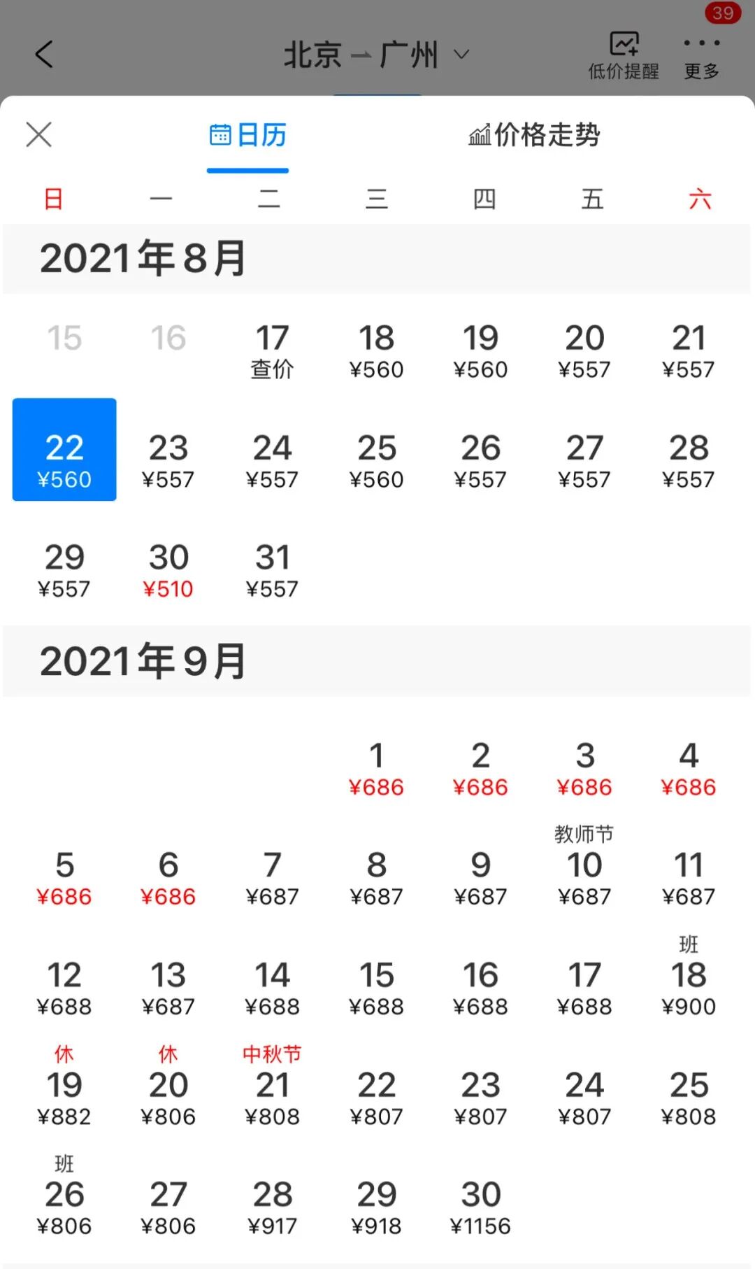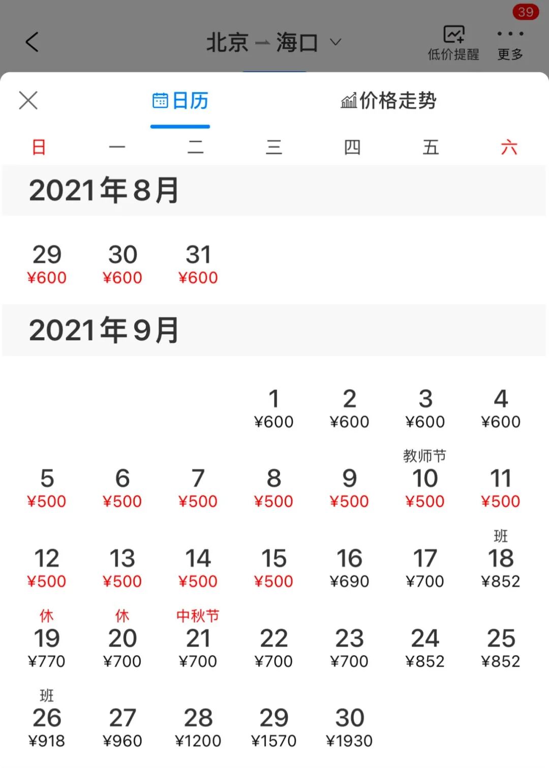以北京-海口为例,某程显示9月前半月票价最低500元,后半月逐渐上升(那是因为低折扣还没放出来)。