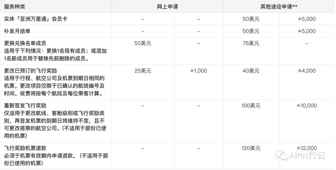 里程票退票收取120美元或者12,000亚万里程手续费;网上申请改签每航段25美元或1,000亚万里程,其他途径申请改签每航段40美元或4,000亚万里程。