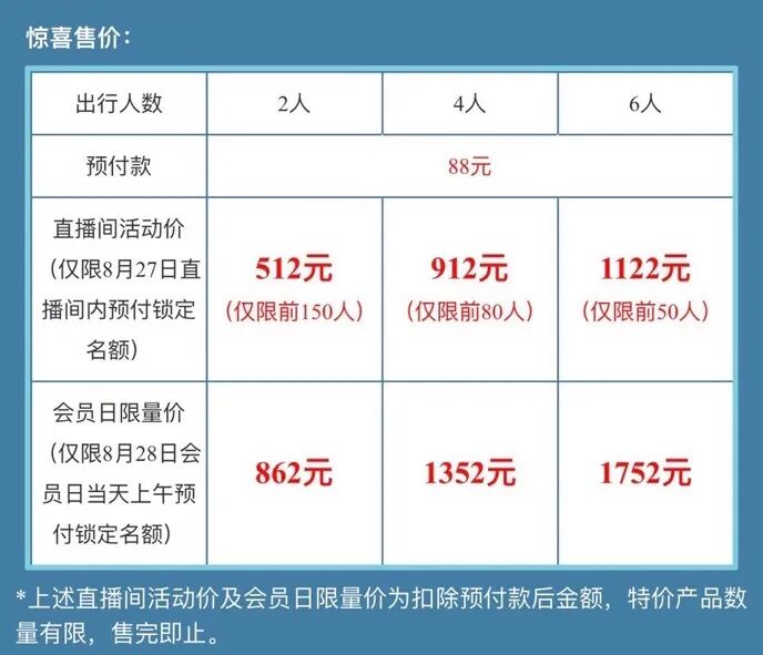 总共分为 2人 / 4人 / 6人 三种套餐,不支持单人购买,明晚8点南航直播间开卖,直播间价格: